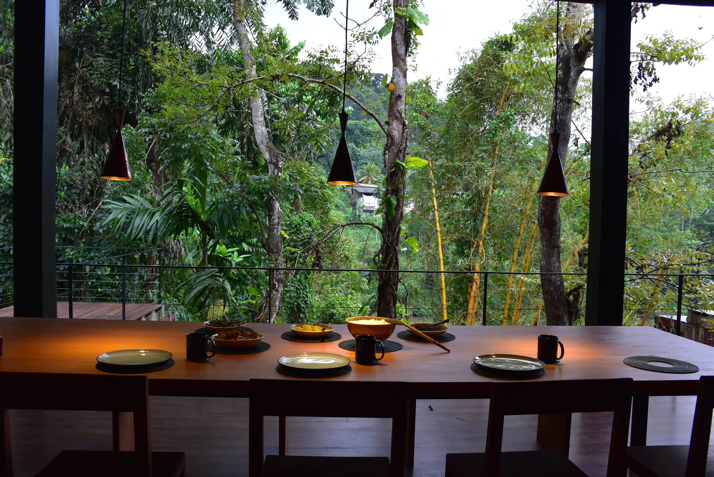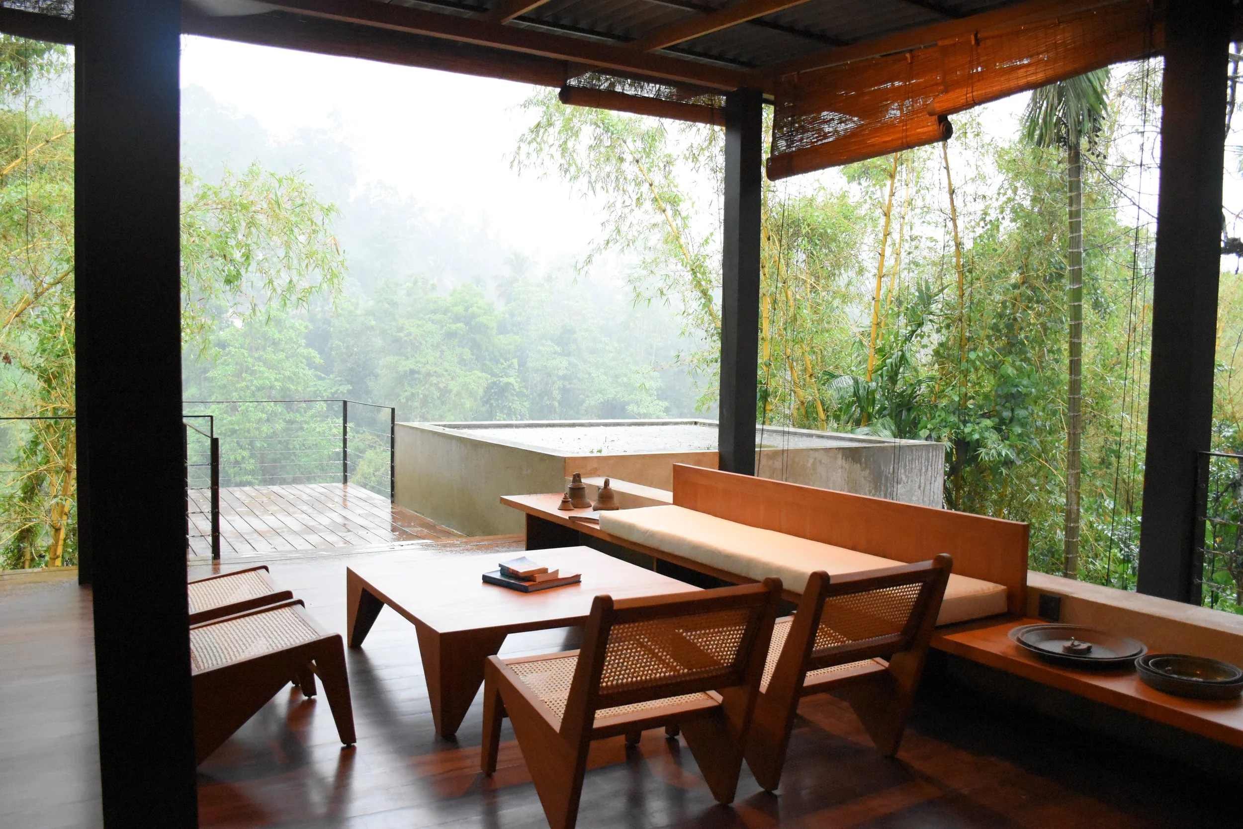 A drive across a long steel bridge across the river, and winding pathways bring one to the entry gate, a steel sheet salvaged from containers leads to the entry court which provides little preparation for panoramic the view that is to be had once the pivot door that opens out to the dramatic tree tops of the rain forest and the cloud laden views of the hills beyond, with the perpetual soothing gush of the river.